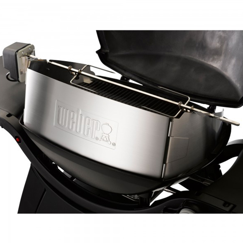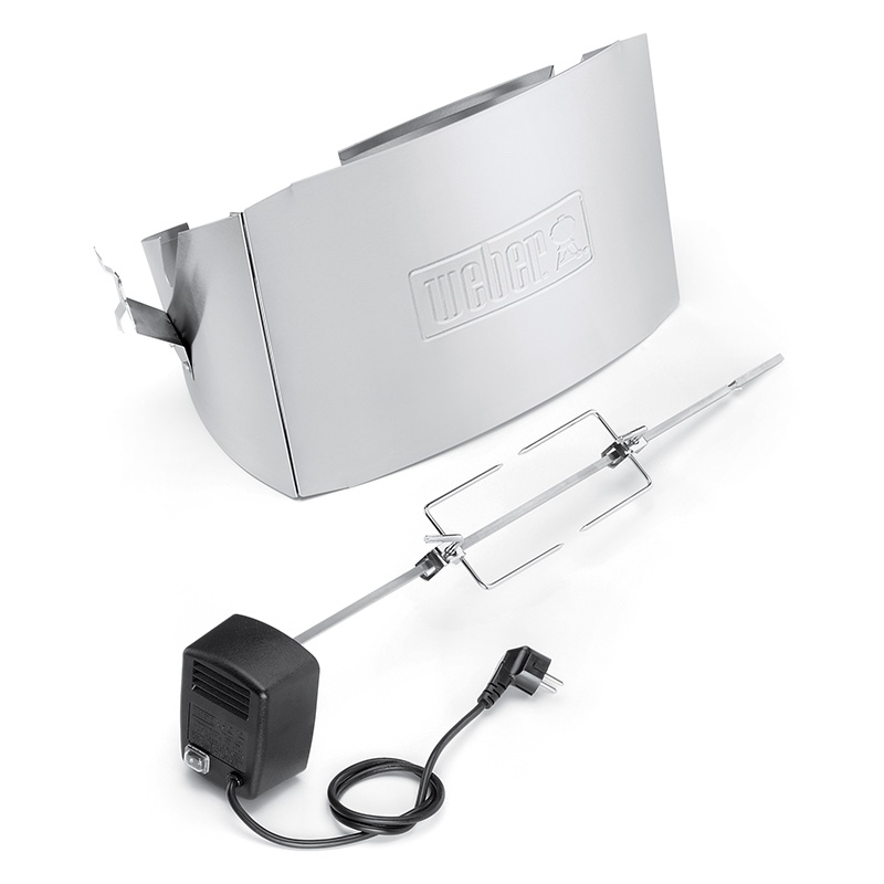Take your repertoire to a whole new level with a Weber Family Q rotisserie. It comes complete with a rotisserie spit and two forks that can handle a whole chicken or large roast. This rotisserie is powered by a heavy duty electric motor to ensure smooth turning for even cooking all the way around.