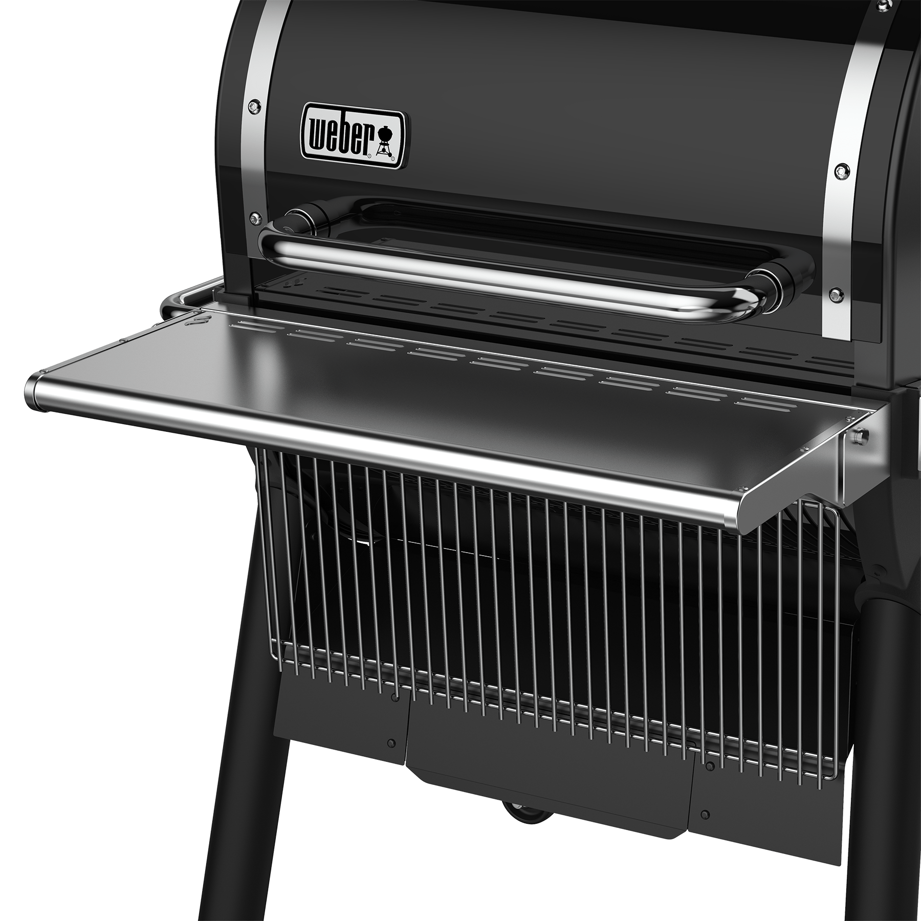 The stainless steel front shelf adds over 1,600 cm2 of extra work space. It accommodates up to 9 kg of food and BBQ necessities including tools, platters, and cutting boards. The clips underneath are specifically designed to hold the upper cooking rack when not in use.