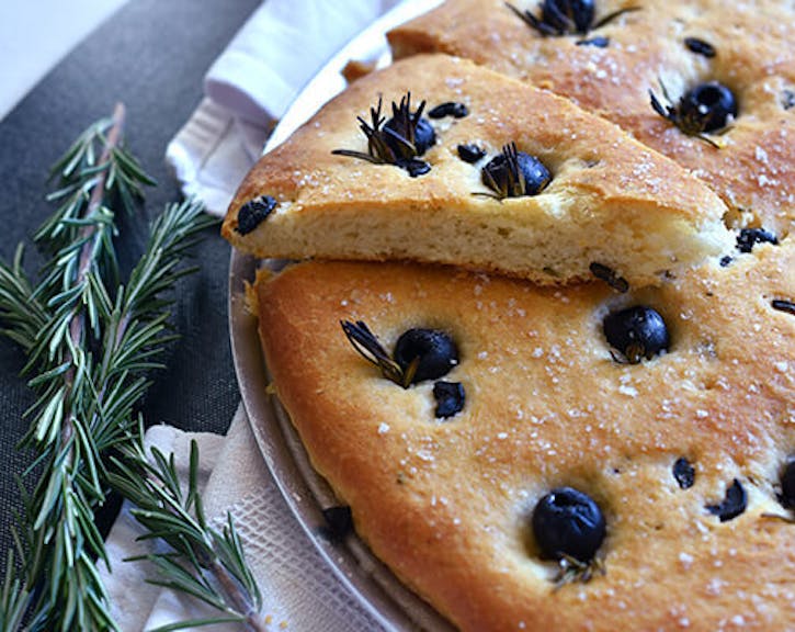 Use your finger to create 20 dimples in the dough. Remove the leaves from the rosemary sprigs and place small bunches of the rosemary and an olive into each dimple. Brush the dough with the remaining 1 tablespoon of olive oil and sprinkle all over with the sea salt flakes.