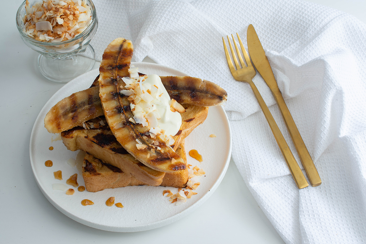 Barbecued French toast is a new breed of breakfast.. Soft, fluffy French toast with crunchy, caramelised stripes from the cooking grill. Serve this with brûléed bananas, toasted coconut flakes and lashings of maple syrup. Perfect for a backyard, camp or on the road brekky.