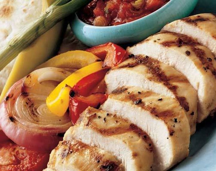 Cook the onion slices, tomato slices, and capsicum quarters on the hotplate and the chicken breasts on the grill over direct medium heat. The chicken and onion will take 4 to 8 minutes each side and the tomato and capsicum will take 3 to 4 minutes each side. Wrap the tortillas in foil and heat for about 1 minute. Cut the capsicum into strips and slice the chicken. Place the chicken, onion, tomatoes, capsicum, and avocado in warm tortillas and roll up to eat. Serve with your favourite salsa.