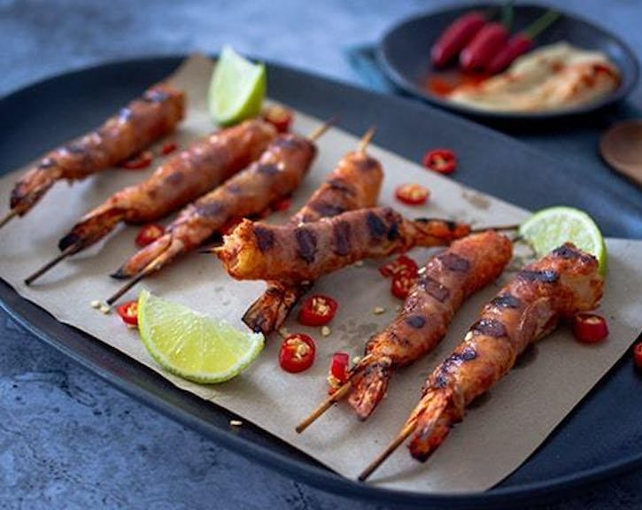 Brush both sides of the prawns with the chilli sauce, and then sprinkle all over with the chipotle chilli powder. Wrap a slice of prosciutto around each prawn. Thread onto skewers, 1 to 2 prawns per skewer.