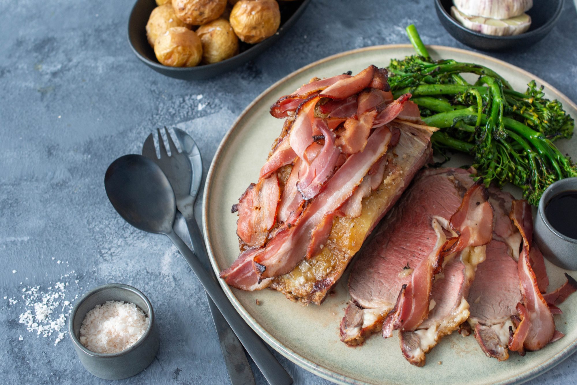 Tender roast beef with crispy pancetta, sweet roasted garlic and a punchy teriyaki sauce. This roast beef will keep your taste buds interested with every mouthful.