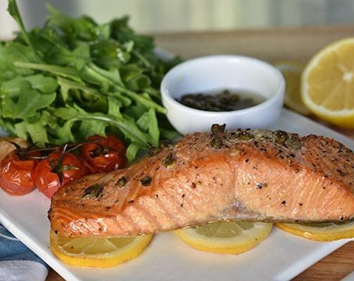 Lightly oil the salmon fillets, cherry tomatoes, and garlic cloves. Season with a little salt (note: the capers will add saltiness) and pepper.