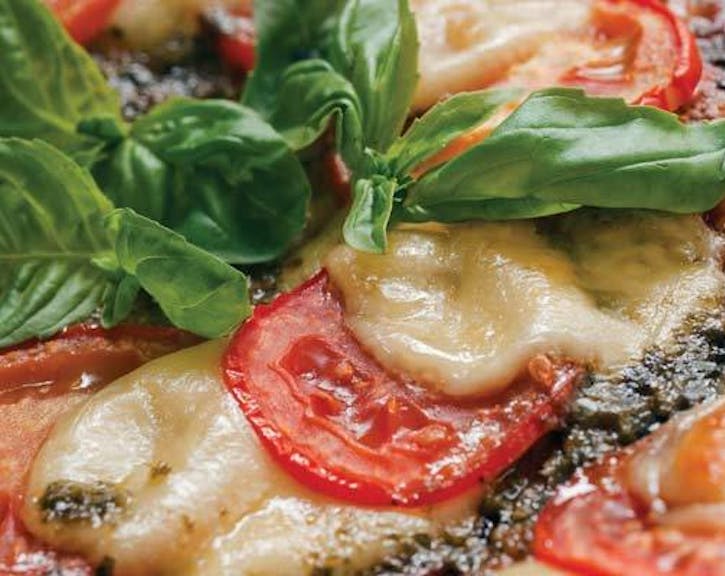 Spread the basil pesto evenly over the pizza base. Top with the sliced tomatoes and bocconcini. Cook on a preheated pizza stone for 15 minutes. Remove from the barbecue and garnish with basil leaves.
