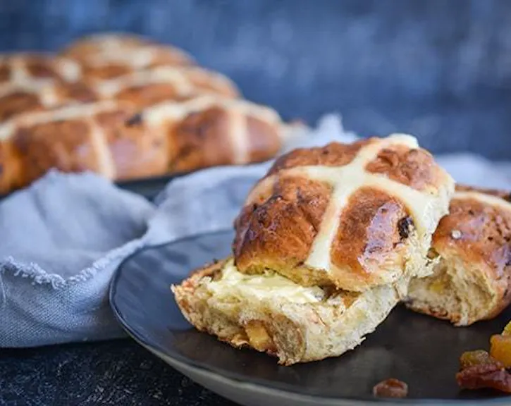 To make the flour paste, combine ¼ cup (60ml) cold water, flour, and sugar in a bowl. Spoon the mixture into a snap-lock bag and snip off one corner. Pipe crosses onto the buns.