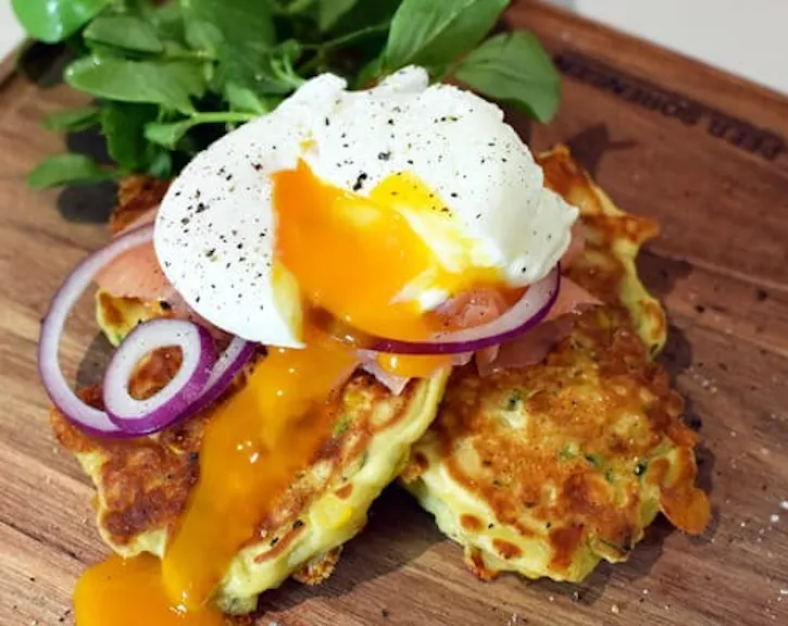 Cook the fritters for 2 minutes on each side or until they have puffed up and are golden. Remove from the hotplate when they are done and cook the next batch. Serve the fritters with smoked salmon and poached eggs, topped with sour cream, rocket, and red onion.